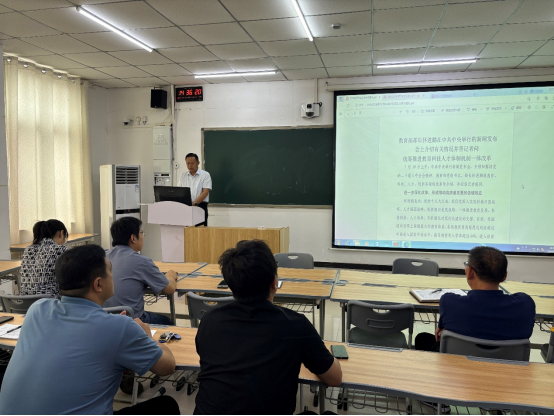 机电工程学院院长黄双成带领大家学习了《教育部部长怀进鹏在中共中央举行的新闻发布会上介绍有关情况并答记者问 统筹推进教育科技人才体制机制一体改革》《中共中央 国务院关于弘扬教育家精神加强新时代高素质专业化教师队伍建设的意见》两个文件。