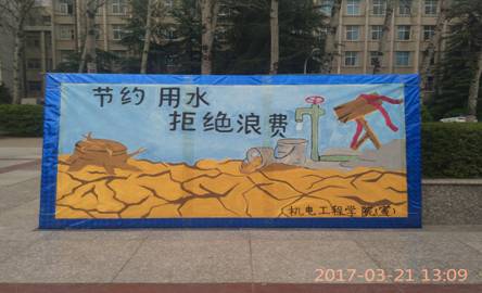 为宣传我国水资源现状及节约用水知识,培养学生热爱水、珍惜水、节约水、保护水的意识,倡导节约观念,建设文明学校,围绕增强节水习惯,树立节水为荣、浪费可耻的正气。根据学院后勤处《2017年“世界水日”、“中国水周”活动方案》的文件要求,2017年3月21日下午1:00机电工程学院50名学生代表在学院北广场参加了主题签名活动。