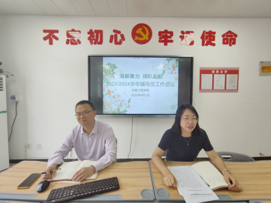 露蝉声渐咽,秋日景初微。为加强学生管理工作规范化、制度化管理,进一步提高思想政治教育工作的实效性,确保新学期学生管理工作有序高效的开展,9月1日上午,机电工程学院在办公楼212召开了2023-2024学年第一学期辅导员工作会议,党总支书记张亮、副书记耿丽敏、学工办主任郭娇娇、团总支书记张光锋、全体机电辅导员参加会议,会议由副书记耿丽敏主持。