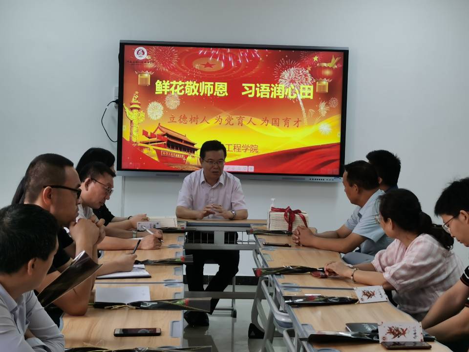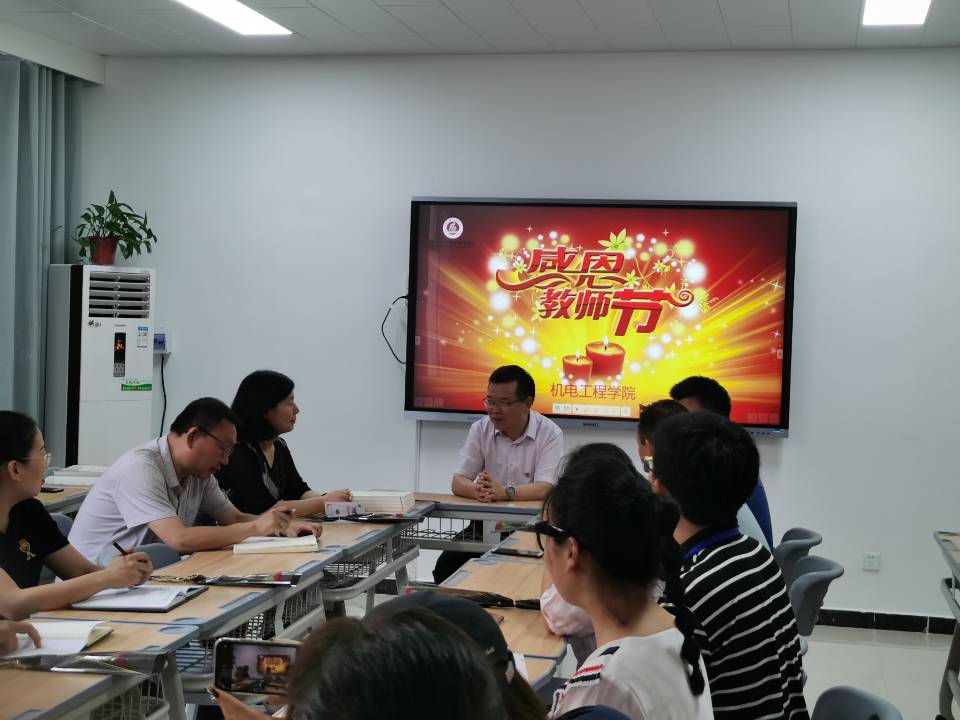 2020年9月10日,在第36个教师节来临之际,学校党委委员范晓伟校长在宣传部部长周燕的陪同下,到自己联系的机电工程学院党总支看望党员教师代表,代表学校送去对各位教师节日的祝福!并给大家送上了《习近平总书记教育重要论述讲义》,希望大家牢记教师初心使命,做“四有”好老师,为学校教育教学的发展做出贡献。并希望机电工程学院在教学方面不断创新,在各方面取得更大成绩。
